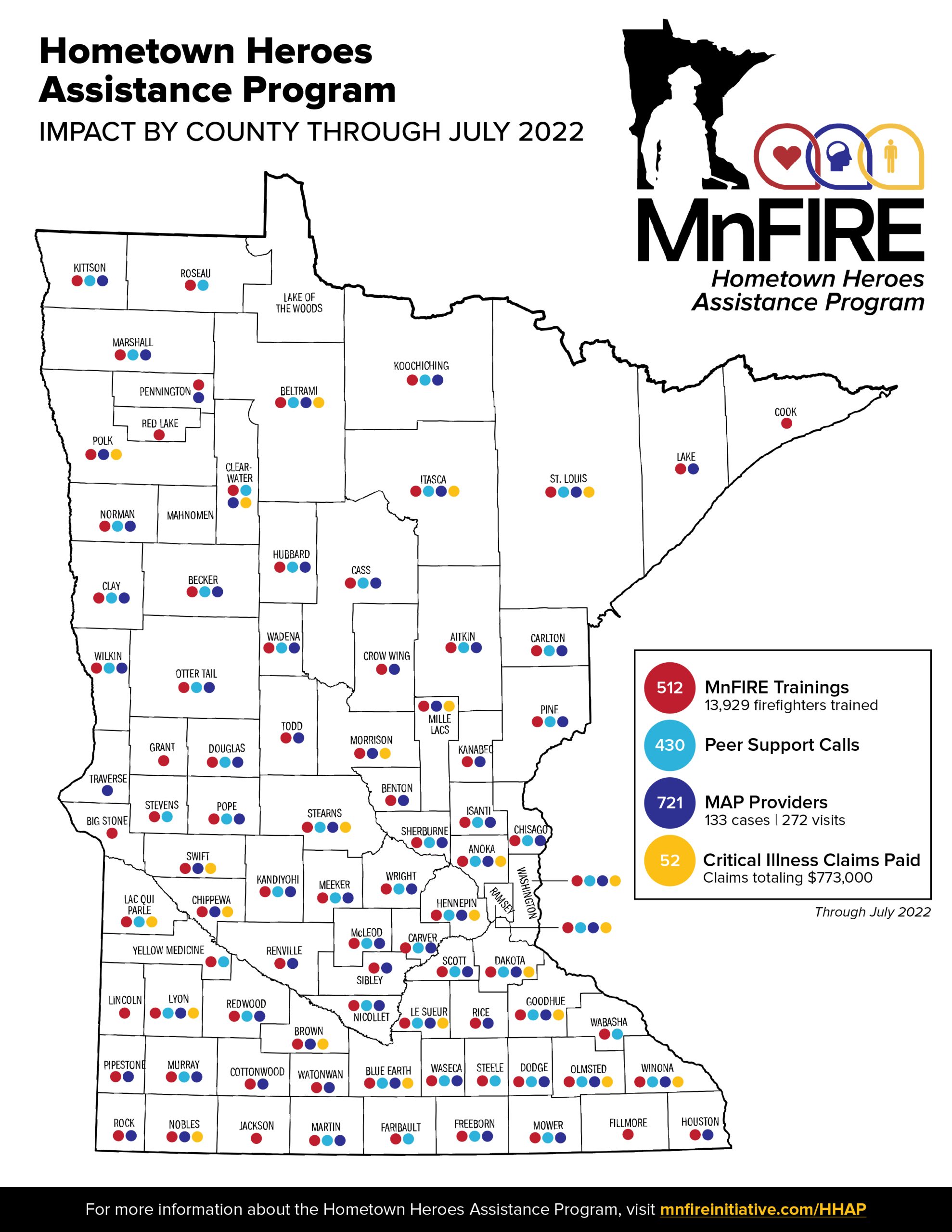 • 721 firefighter-focused mental health providers across the state to offer up to five no-cost counseling sessions to firefighters and their families. To date the MnFIRE Assistance Program has facilitated 272 provider visits.