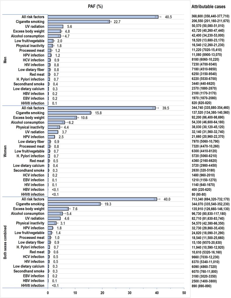 Estimated proportion and number of incident cancer cases (excluding nonmelanoma skin cancers) attributable to evaluated risk factors in adults 30 years and older by sex, United States, 2019.